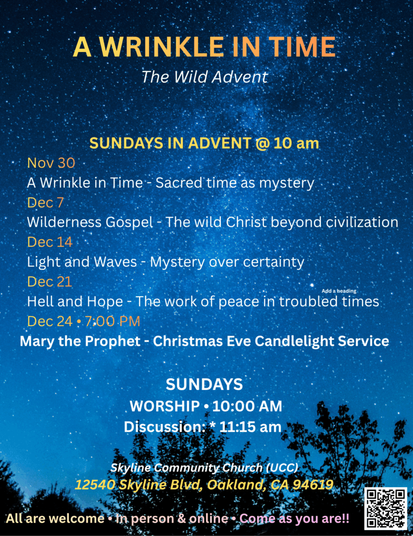 This Advent at Skyline Community Church, we’re exploring time, wilderness, light, and hope in ways that honor both our questions and our longings. Drawing on the reflections of theologian Diana Butler Bass, we’ll journey through an Advent that is wild, honest, and deeply engaged with the justice work our world so desperately needs.