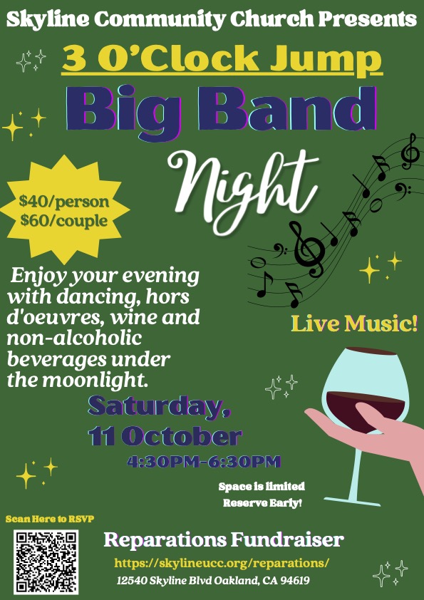 This BIG BAND EVENT will be a lovely evening of music, dance, wine and hors d’oeuvres in the beautiful outdoor patio of Skyline Community Church, high in the Oakland Hills – right before Sunset!